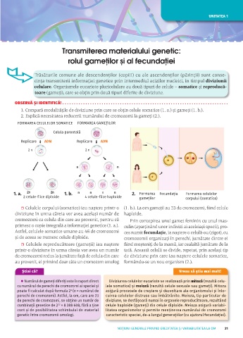 1. Compară modalitățile de diviziune prin care se obțin celule somatice (1. a.) și gameți (1. b.).