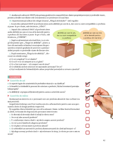 II. Analizează cadranele SWOT prin prisma gradului de compatibilitate dintre propriul potențial și profesiile vizate,