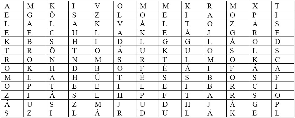 A felsorolt fizikai jelenségeket VI. osztályban tanultad. Néhányat közülük elrejtettünk az alábbi betűháló vízszintes és függőleges soraiban. Találd meg ezeket!