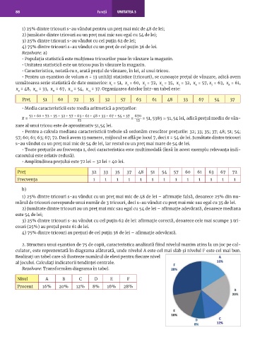 2) Jumătate dintre tricouri au un preţ mai mic sau egal cu 54 de lei – afirmaţie adevărată, deoarece mediana