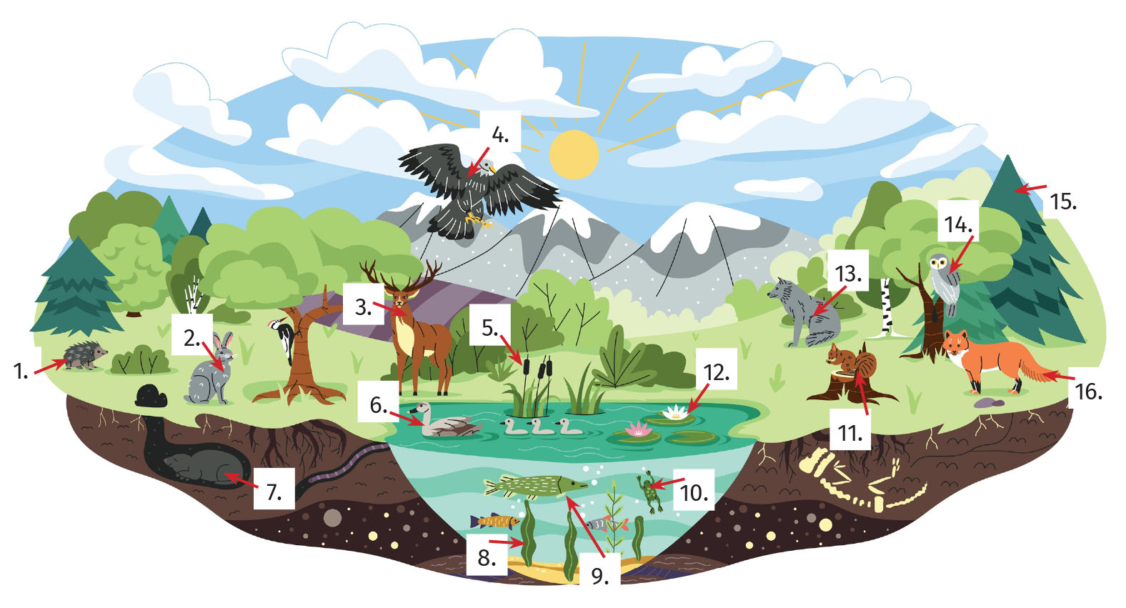 vultur, broască, veveriță, nufăr, vulpe, cârtiță, iepure, știucă, papură, veveriță, algă, cerb, lebădă, arici, brad, lup, cucuvea.